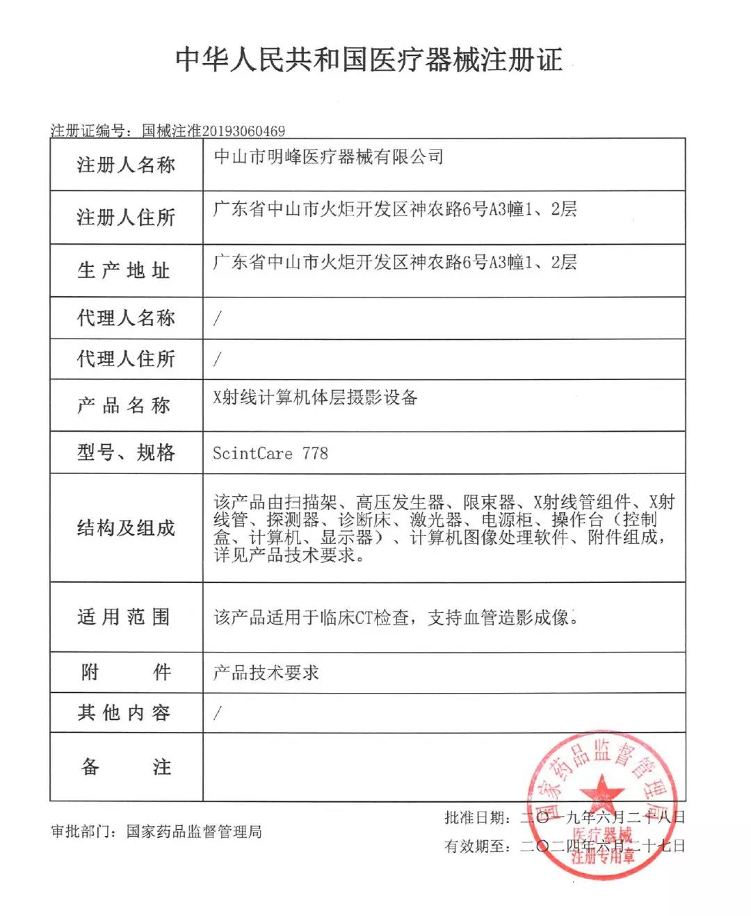 近日,國(guó)家健康基地園區(qū)企業(yè)——中山市明峰醫(yī)療器械有限公司迎來喜訊,其自主研發(fā)的128層CT機(jī)獲得了國(guó)家藥品監(jiān)督管理局頒發(fā)的醫(yī)療器械注冊(cè)證。