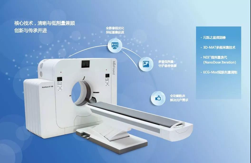明峰醫(yī)療128層CT在心臟掃描應(yīng)用上采用ECG門控技術(shù)和實(shí)時(shí)的ECG波形分析,可以顯著減少心臟掃描的劑量。該設(shè)備采用閃爍之星探測(cè)器——最新型的集成化探測(cè)器技術(shù),在整體架構(gòu)、材料學(xué)設(shè)計(jì)、集成芯片技術(shù)方面均達(dá)到國(guó)內(nèi)領(lǐng)先的技術(shù)水平;3D-MAT多頻采集技術(shù)實(shí)現(xiàn)了在多倍的空間頻率范圍內(nèi)更多數(shù)據(jù)的采集,使精細(xì)解剖結(jié)構(gòu)顯示更加真實(shí)清晰;NDI+微劑量迭代,將人工智能AI技術(shù)融入迭代算法,打造最高端的軟硬件平臺(tái)。