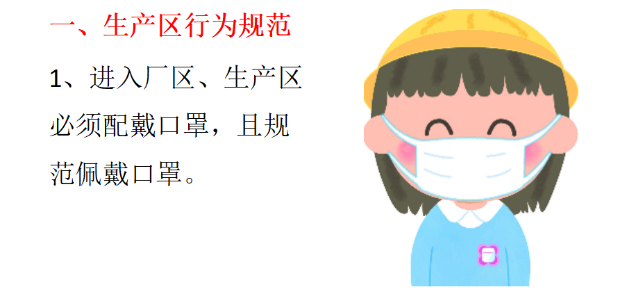 據公司生產技術部負責人羅麗敏介紹,這份疫情防控行為規(guī)范分為生產區(qū)行為規(guī)范、生產區(qū)清潔規(guī)范、就餐行為規(guī)范、生活區(qū)注意事項、洗手及佩戴口罩方法六大防疫防控重點,每一項均有具體的操作細則,及示意圖。