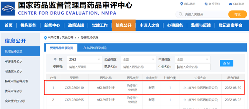 圖:CDE官網(wǎng)已受理AK130的臨床試驗(yàn)申請(qǐng)