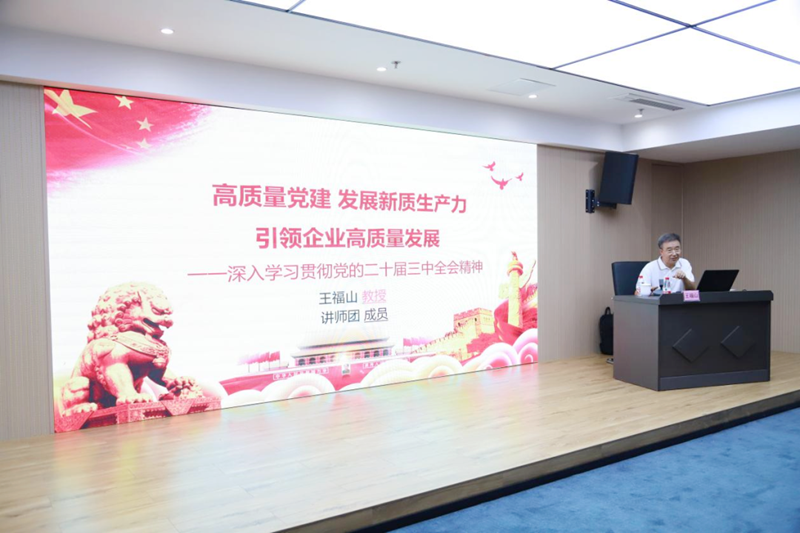 宣講會邀請中山市委宣講團成員、習近平法治思想宣講團成員、電子科技大學中山學院教授王福山作題為《高質(zhì)量黨建 發(fā)展新質(zhì)生產(chǎn)力 引領(lǐng)企業(yè)高質(zhì)量發(fā)展》專題輔導。王教授從深刻認識黨的二十屆三中全會的歷史意義、黨的二十屆三中全會議題和客觀需要、關(guān)于決定稿基本框架及特點、深化黨的建設(shè)制度改革、以高質(zhì)量黨建引領(lǐng)國企高質(zhì)量發(fā)展、找準路徑加快培育發(fā)展新質(zhì)生產(chǎn)力等方面,對黨的二十屆三中全會精神作全面系統(tǒng)的闡釋,并深入剖析《中共中央關(guān)于進一步全面深化改革、推進中國式現(xiàn)代化的決定》。宣講站位高遠、內(nèi)容豐富,尤其對《決定》中涉及國資國企改革的重要內(nèi)容作了深刻解讀,對全體黨員干部全面理解和準確把握黨的二十屆三中全會精神的豐富內(nèi)涵、實質(zhì)要義具有指導意義。