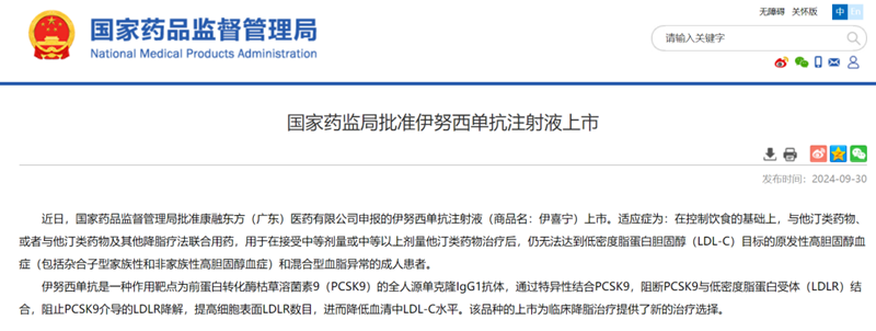 9月30日,中國國家藥監(jiān)局(NMPA)官網(wǎng)宣布,健康基地園區(qū)企業(yè)康方生物的新藥伊喜寧®(伊努西單抗,PCSK9)獲批上市。獲批適應癥為:原發(fā)性高膽固醇血癥和混合型高脂血癥,以及雜合子型家族性高膽固醇血癥(HeFH)。伊努西單抗是康方生物在非腫瘤領域的首個獲批產(chǎn)品,也是第5個進入商業(yè)化階段的自主創(chuàng)新藥物。伊努西單抗的獲批,開啟了腫瘤及非腫瘤兩大業(yè)務板塊協(xié)同開拓創(chuàng)新的嶄新局面,將為企業(yè)的中長期全球化發(fā)展奠定堅實的基礎。