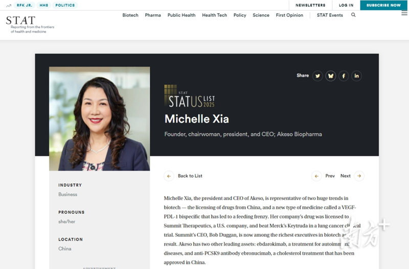 近日,國(guó)際著名生物醫(yī)藥行業(yè)媒體STAT發(fā)布了全球生命科學(xué)領(lǐng)域《The 2025 STATUS List》(2025年領(lǐng)軍人物榜單)。該榜單從全球醫(yī)療政策、生物技術(shù)、衛(wèi)生技術(shù)、醫(yī)學(xué)和衛(wèi)生保健等領(lǐng)域,遴選了對(duì)塑造健康與生命科學(xué)未來全球最具有影響力的50位領(lǐng)軍人物。健康基地園區(qū)企業(yè)康方生物創(chuàng)始人、董事長(zhǎng)、總裁兼首席執(zhí)行官夏瑜入選,成為唯一獲此殊榮的亞洲企業(yè)CEO。