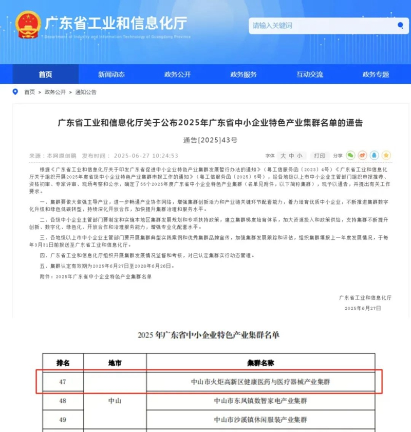 近日,廣東省工業(yè)和信息化廳正式發(fā)布《廣東省工業(yè)和信息化廳關于公布2025年廣東省中小企業(yè)特色產業(yè)集群名單的通告》。其中,中山火炬高新區(qū)健康醫(yī)藥與醫(yī)療器械產業(yè)集群成功入選。