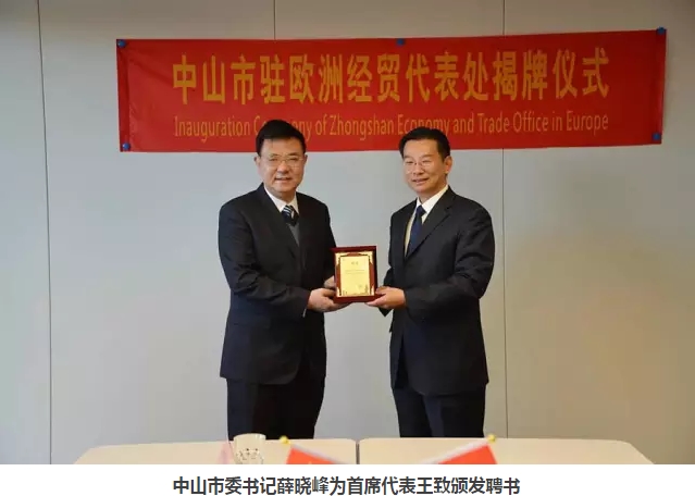 在揭牌儀式上,薛曉峰表示,中山市駐歐州經(jīng)貿(mào)代表處的成立是中山扎根歐洲開展雙邊經(jīng)貿(mào)合作的開始,希望代表處發(fā)揮好信息傳遞、城市推介、招商引資、對(duì)接交流等職能,加快推動(dòng)中山中瑞(歐)工業(yè)園的建設(shè),探索出中山與歐州合作的創(chuàng)新模式,同時(shí)薛曉峰書記向獲聘任的代表處首席代表頒發(fā)了聘書。