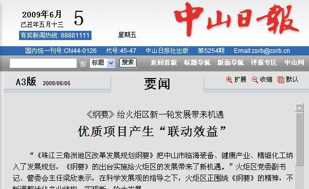 “《珠江三角洲地區(qū)改革發(fā)展規(guī)劃綱要》把中山市臨海裝備、健康產(chǎn)業(yè)、精細化工納入了發(fā)展規(guī)劃,《綱要》的出臺實施給火炬區(qū)的發(fā)展帶來了新機遇!被鹁鎱^(qū)黨委副書記、管委會主任梁欣表示,在科學發(fā)展觀的指導之下,火炬區(qū)正圍繞《綱要》的精神,不斷調(diào)整優(yōu)化產(chǎn)業(yè)結(jié)構(gòu),實現(xiàn)新一輪大發(fā)展。